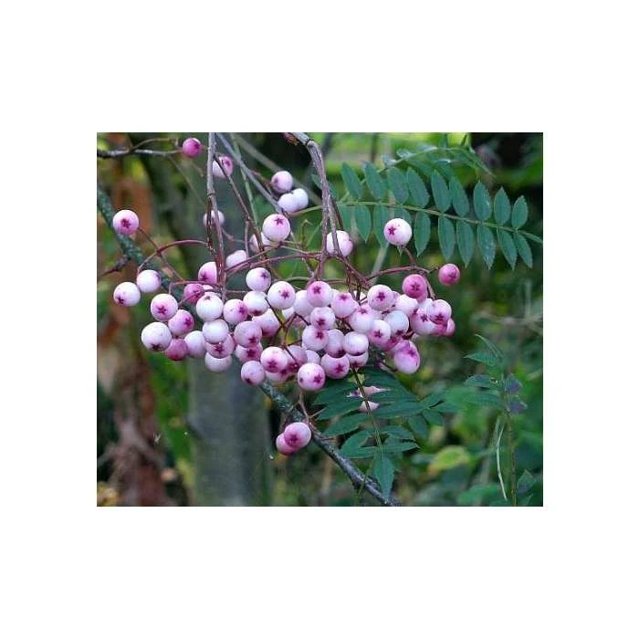 A beautiful compact Sorbus, perfect for the smaller garden. Sorbus vilmorinii boasts finely formed fern-like foliage that turns to vibrant red and purple in autumn. Large heads of creamy white flowers in spring are followed by open bunches of rosy red berries that fade through pink to almost white. The berries are irresistible autumn food for birds.